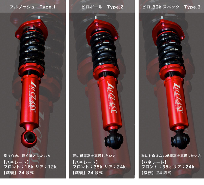 ファーストクラスオリジナル車高のタイプ2、タイプ3はスライドピロアッパー、ロアピロ付きに
